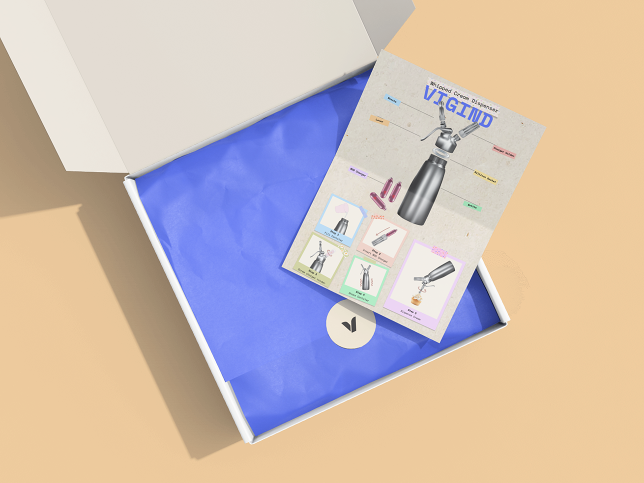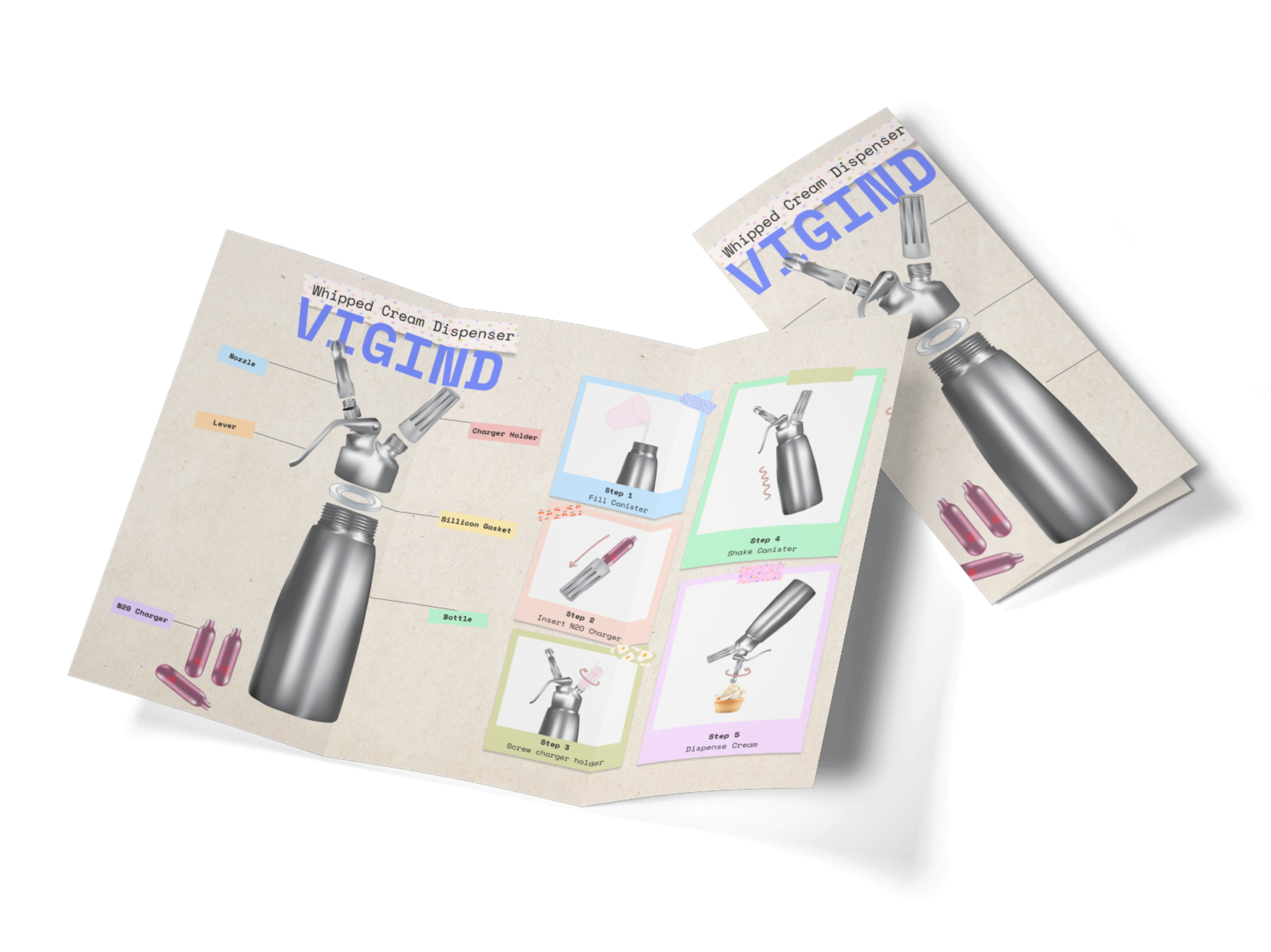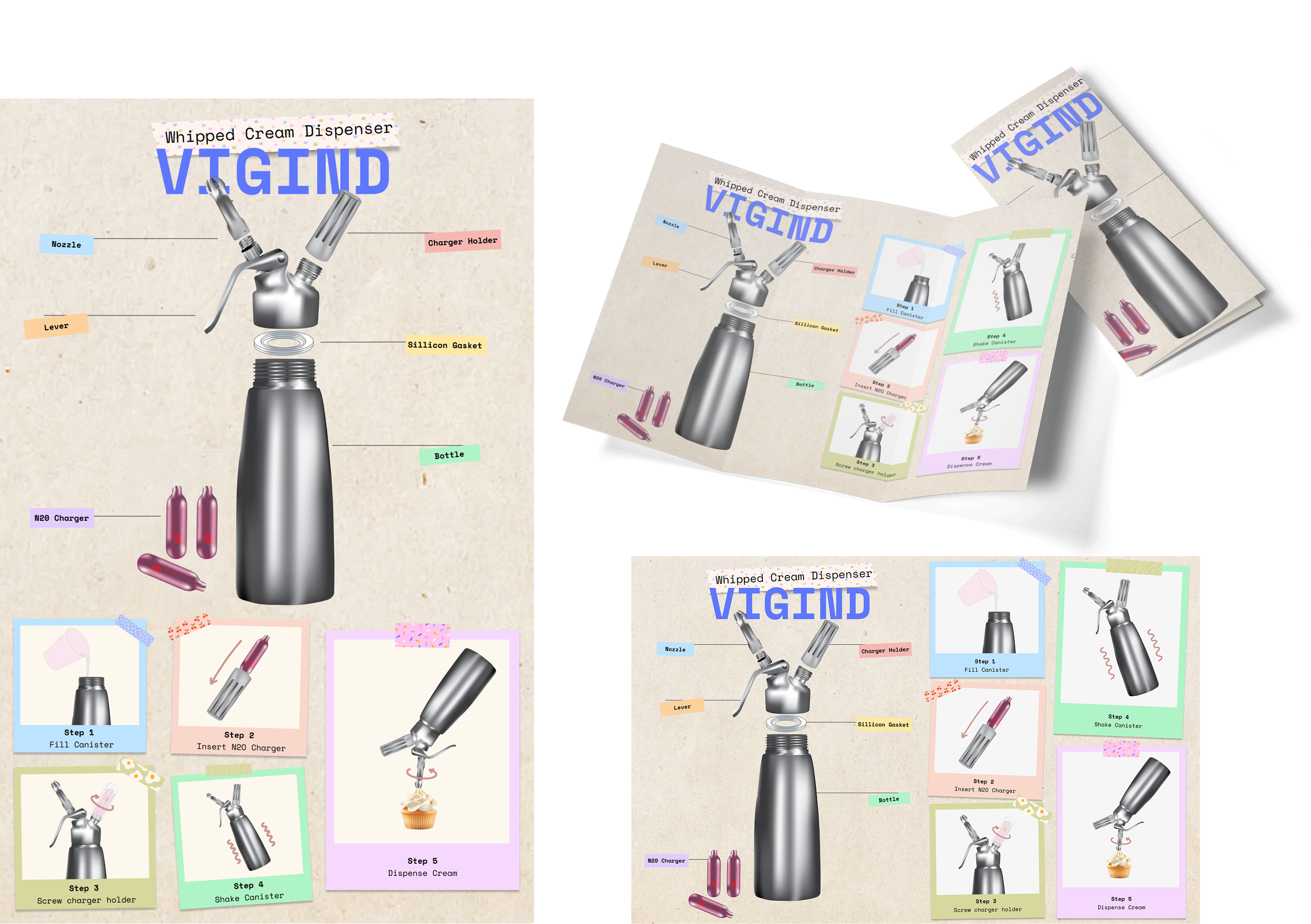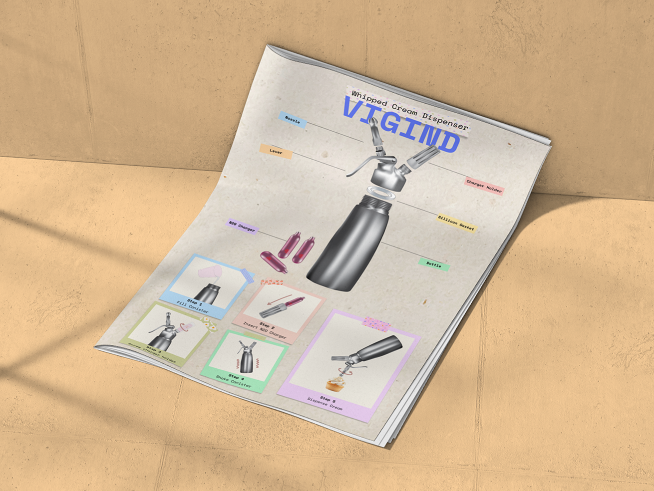 Creating an instructional infographic of Vigand's whipped cream dispenser in a playful Polaroid-inspired style to make the visual presentation approachable and engaging, ensuring that diverse users can easily follow the instructions.